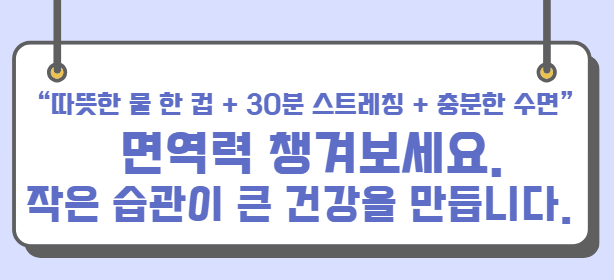👉 오늘부터 “따뜻한 물 한 컵 + 30분 스트레칭 + 충분한 수면”으로 면역력 챙겨보세요.