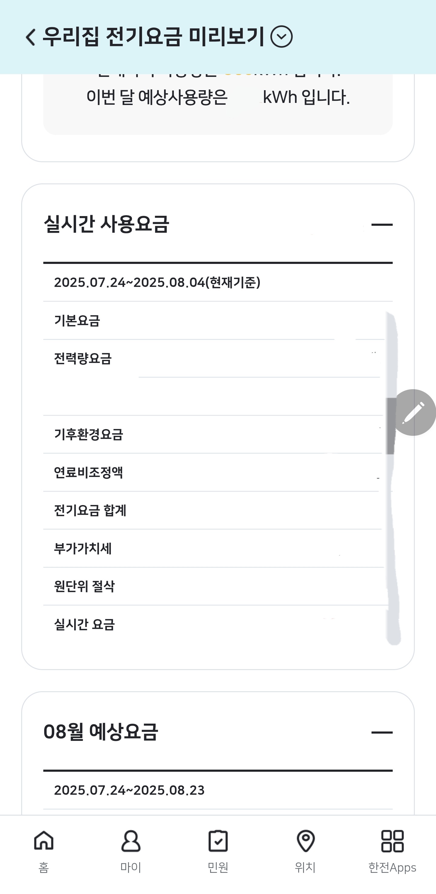 공식 어플을 이용하면 실시간 사용량과 예상 요금까지